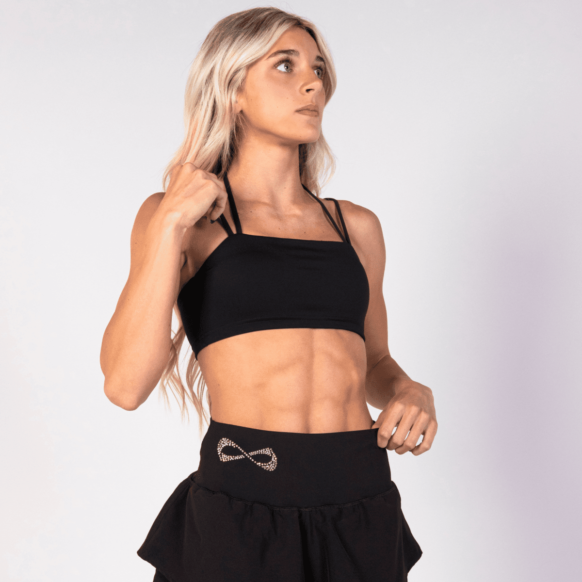 Stay confident and comfortable in this Nfinity sports bra, designed for maximum support during your most intense stunting and tumbling practices. With a sleek, strappy halter back and a minimalistic front, it offers both style and functionality to keep you moving freely through every performance. The soft, moisture-wicking fabric ensures you stay cool and dry, allowing you to focus on hitting your skills without distraction during even the longest practices or performances.